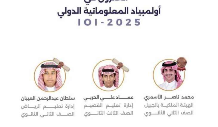 وأفادت مؤسسة الملك عبدالعزيز ورجاله للموهبة والإبداع "موهبة" أن الطالب محمد ناصر الأسمري من تعليم الهيئة الملكية بالجبيل حصل على ميدالية برونزية، فيما حصل الطالب عماد علي الحربي من تعليم القصيم، والطالب سلطان عبدالرحمن العيبان من تعليم الرياض، على شهادتي تقدير.