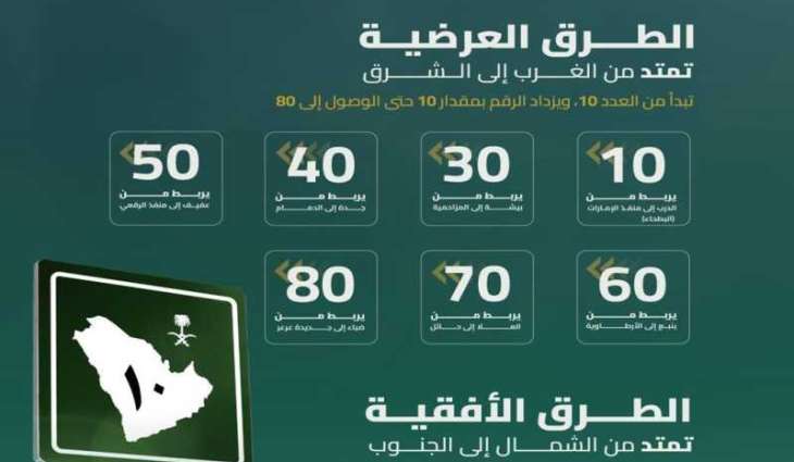 وأضافت الهيئة أن الطرق الأفقية تمتد من شمال المملكة إلى جنوبها، وتبدأ أرقامها من الرقم 5 وتزداد بمضاعفاتها حتى الوصول إلى الرقم 95.