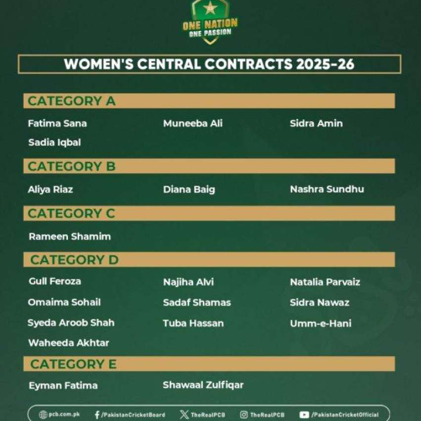 Among the 20 contracted players, Aliya Riaz (Category B), Natalia Parvaiz (Category D), Sidra Nawaz (Category D), Waheeda Akhtar (Category D), Eyman Fatima and Shawaal Zulfiqar (both Category E) are new inclusions.