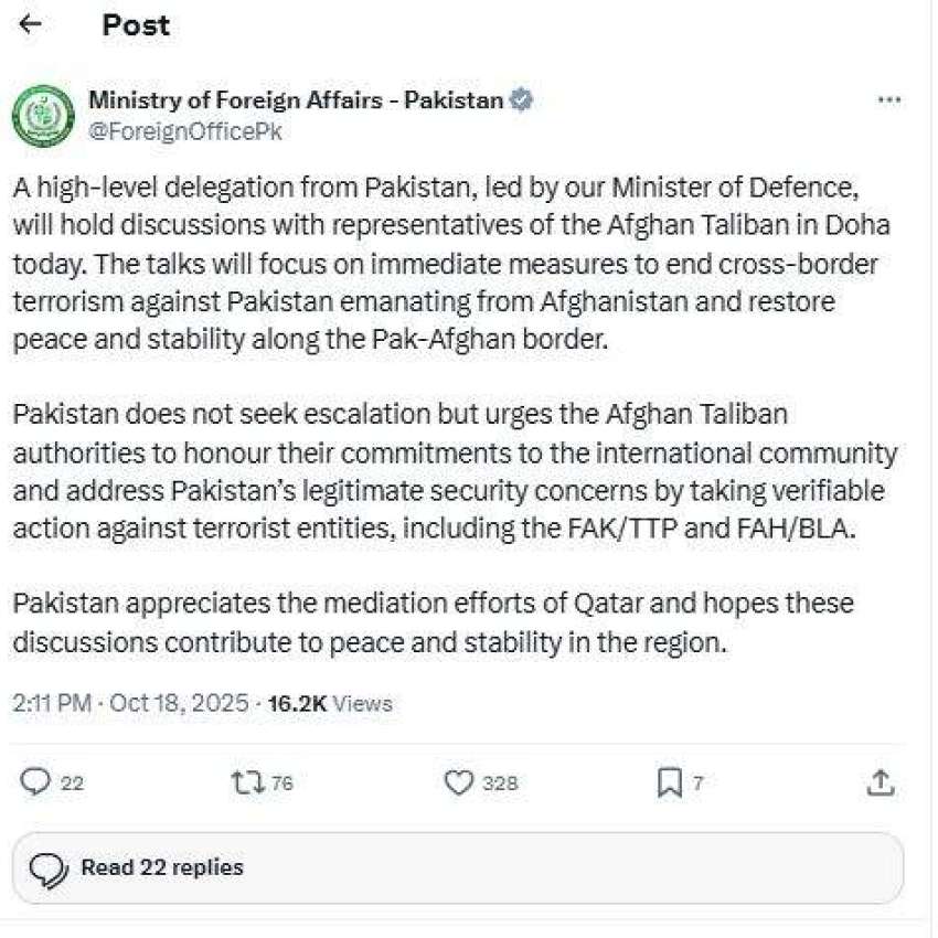 MOFA says delegation’s discussions in Doha will focus on immediate cessation of cross-border terrorist activities originating from Afghanistan